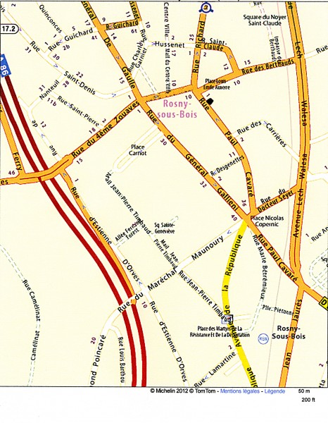 A la gare de Rosny-sous-Bois, prendre la sortie de gauche, et remonter une petite pente pour arrivez à un carrefour. En face de vous, vous verrez une annexe de la mairie. La rue Paul Cavaré est celle qui se trouve à droite de cette annexe. Et c'est à deux-trois minutes à pieds.