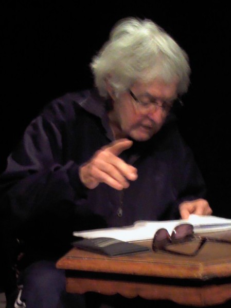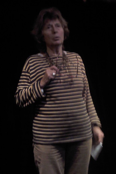 Michèle LASSIAZ ouvre la soirée et fait les premières constatations. Bien que tout soit calme pour l’instant, elle annonce l’arrivée du vent, du vent de sable. Elle n’a pas de sable sous les pieds mais elle se voit marcher en plein désert, quelque part, entre le Tassili n’ Ajjer et le Tassili du Hoggar. Puis, elle monte sur le dos de petits chameaux, croise une femme en bleu, lui demande la direction de Tamanrasset. Elle évoque l’image du père De Foucault, qui, lui, traversait le désert les yeux fermés, sous le regard des femmes berbères.
