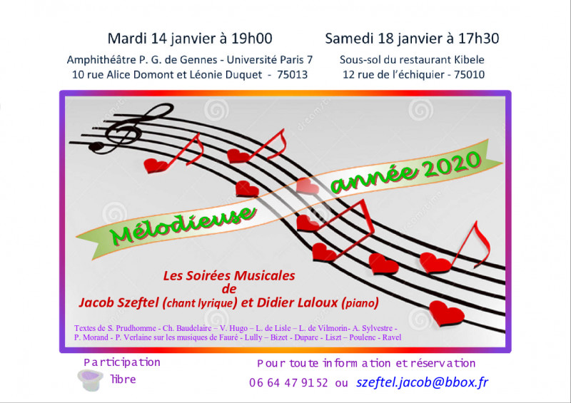 14-18/01 La Ruche des Arts vous annonce Jacob SZEFTEL -Chant- Didier Laloux -piano dans deux Concerts lyriques Posté le 08/01/2020 - Par La Ruche des Arts, Michèle Lassiaz , Chr Sur le Feu de la Ruche