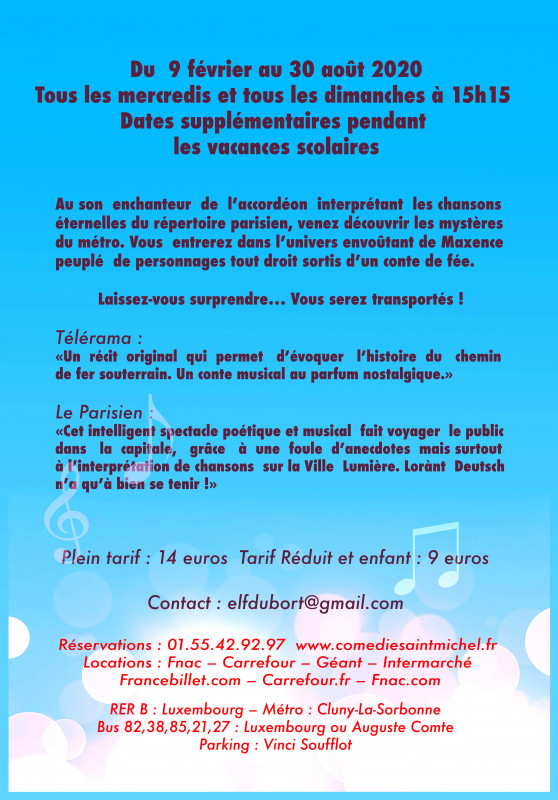 09/02-03/03 La Ruche des Arts vous annonce Elfriede Dubort dans Maxence ou Le Conte du Métro Posté le 09/03/2020 - Par La Ruche des Arts, Michèle Lassiaz , Chr Sur le Feu de la Ruche