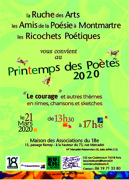21/03 Le Printemps des Poètes 2020 Collectif Ruche des Arts, les Amis de la poésie à Montmartre, les Ricochets poétiques,à la Maison des Associations du 18ème est ,reporté à une date ultérieure Posté le 25/03/2020 - Par La Ruche des Arts, Michèle Lassiaz, Alain Briantais, Didier Laloux,Chr Sur le Feu de la Ruche