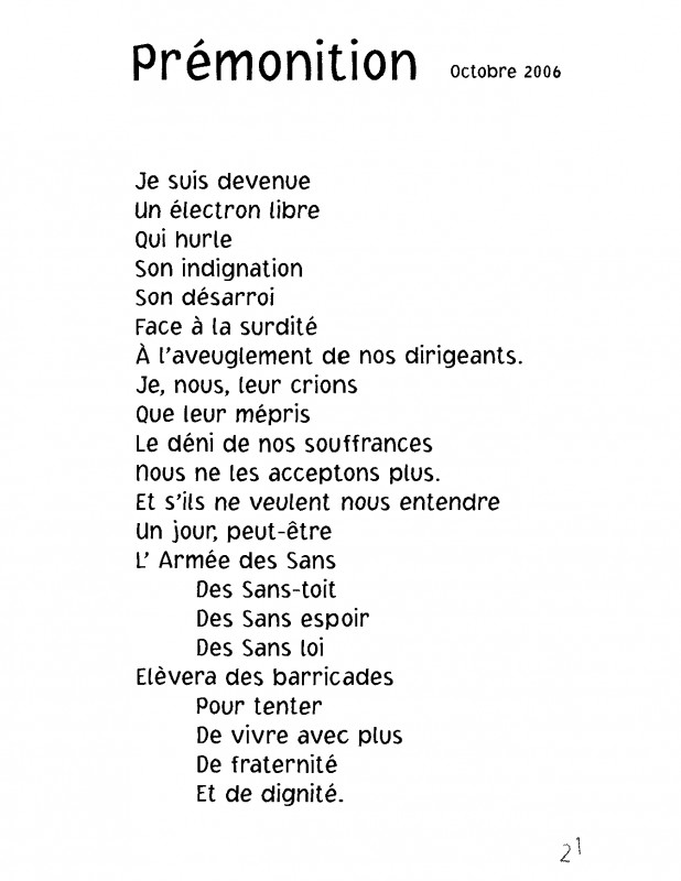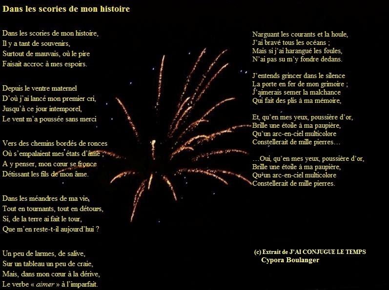 Autres nouveaux poèmes:dans Florilège de Poèmes 03-04 : Pascal Hérault, Claudine Vanlé, Mariéva Sol, Alain Pizerra, Charlotte-Rita, Eric Meyleuc, Cypora Boulanger, Christian Lafont Jean-Dominique Dupont, Oguene, Catie Canta, Eric Meyleuc, Jean-François Maljean, Elisabeth Sanguinetti, Marieva Sol , Pedro Vianna, Roselyne Allen ... et vous ?