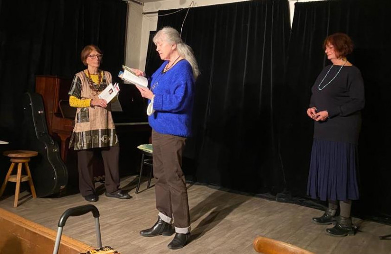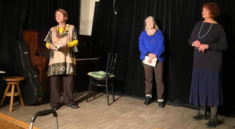 Elle enchaine poétiquement avec l'un de ses poèmes et nous présente Catie Canta accompagnée au piano, par Didier Laloux, qui nous interprète ses premières chansons que nous applaudissons, rejointe bientôt sur scène, par Oguène, Michèle Lassiaz, pour un florilège de poèmes à trois, chacune dans son style particulier et différent, applaudi, comme il se doit, très chaleureusement.