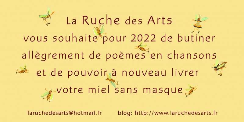 01/01/2022 La Ruche des Arts vous souhaite de butiner allègrement de poèmes en chansons Posté le 21/01/2022 - Par la Ruche des arts, Michèle Lassiaz,Al Briantais,Didier laloux Chr lafont Sur le Feu de la Ruche