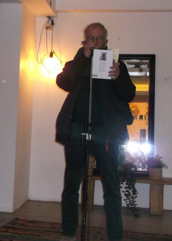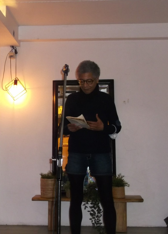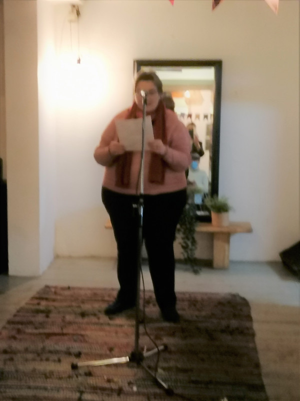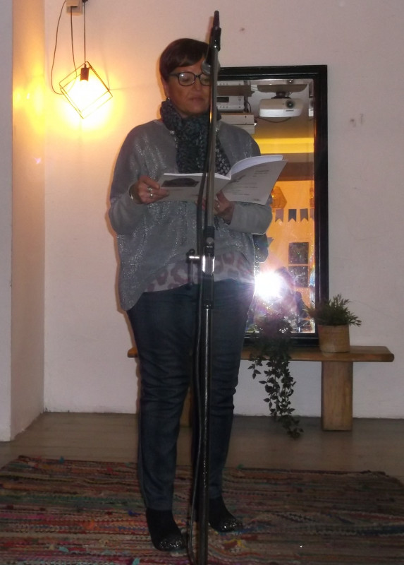 La soirée débute avec un texte de Charlotte Rita qui, empêchée, a mandaté Didier Laloux pour nous lire « en ce jour éthéré », là où « la tendresse explose entre jamais et toujours ». Cécile prend la suite avec des jours de pluie, des petits cafés noirs, et des feux rouges. Plus tard elle reviendra avec un texte fort en jeux de mots qui « perlinpinpinent » !