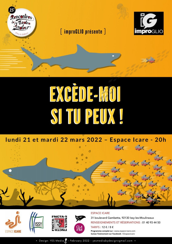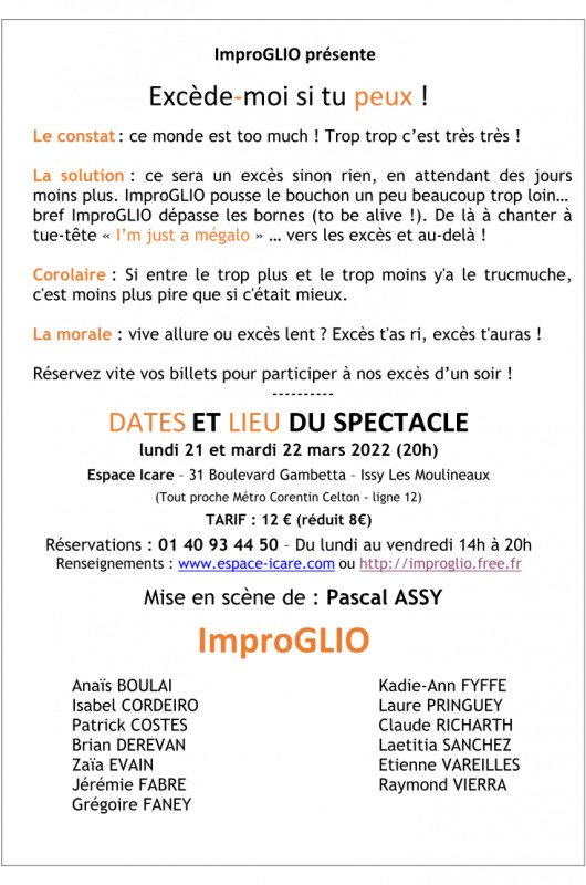 http://Improglio.free.fr - Réservations : 01 40 93 44 50 – 14h-19h - https://www.espace-icare.com/theatre-amateur2022