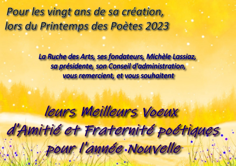 Que le CA de la Ruche des Arts prolonge en souhaitant à chacun et chacune une belle année 2023. Elle espère en profiter pleinement pour fêter joyeusement ses vingt ans lors du Printemps des Poètes