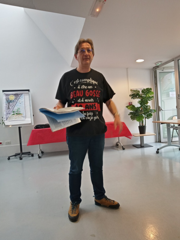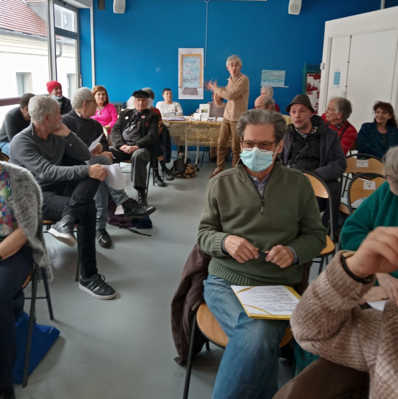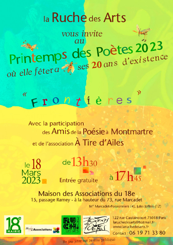 Ah le beau Printemps des Poètes 2023 … Un petit soleil timide aux fenêtres, une salle de la Maison des Associations remplie à fond, nous eûmes les meilleures conditions pour réussir cette journée. Ce fut un printemps ruchois pas comme les autres, exceptionnel. Le thème, « les frontières » lourd de significations, engendra des moments très créatifs, graves, et drôles aussi.
