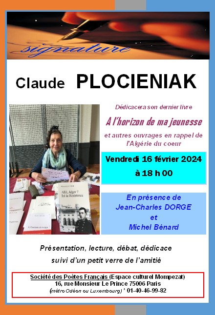 16/02/2024 La Ruche des Arts relaie l'information Serge Carbonnel participe au lancement du livre de Claude Plocieniak à la Société des Poètes Français Posté le 11/02/2024 - Par La Ruche des Arts, Michèle Lassiaz, Alain Briantais, Christian Lafont Sur le Feu de la Ruche