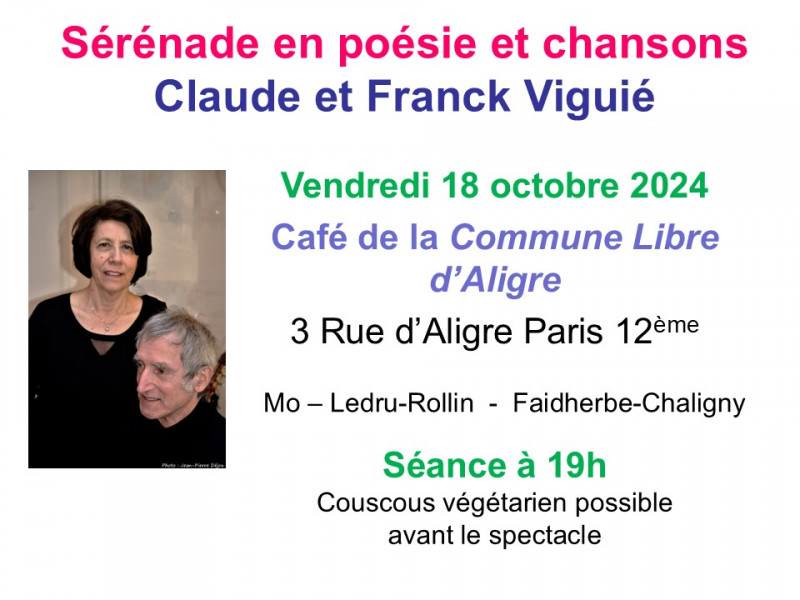 18/10/2024 La Ruche des Arts vous annonce et relaie l'information Sérénade en Poésie et Chansons par Claude et Franck Viguié ,à la Commune Libre d'Aligre Posté le 16/10/2024 - Par La Ruche des Arts,Michèle Lassiaz,Alain Briantais, Christian Lafont Sur le Feu de la Ruche