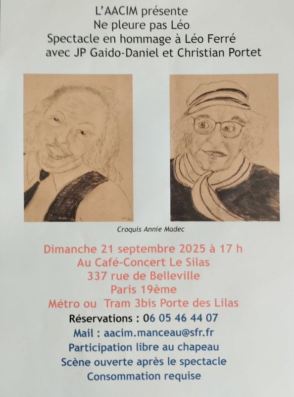 2109/2025 La Ruche des Arts relaie l'information Concert Spectacle en hommage à Léo FERRE au Café Concert Le SILAS à Paris 19ème Posté le 16/09/2025 - Par La Ruche des Arts, Michèle lassiaz, Alain Briantais, Christian Lafont Sur le Feu de la Ruche