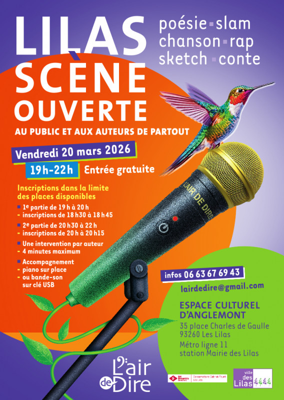 20./03/2026 La Ruche des Arts vous annonce et relaie l'information LiLAS Scène Ouvertepar L'Air de Dire aux Portes de Paris Posté le 03/03/2026 - Par La Ruche des Arts, Michèle lassiaz, Alain Briantais, Christian Lafont Sur le Feu de la Ruche